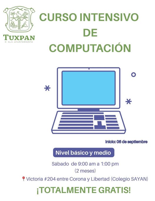 El Gobierno de Tuxpan, en conjunto con el Colegio SAYAN, te invita a formar parte del Curso Intensivo de Computación , en niveles básico y medio